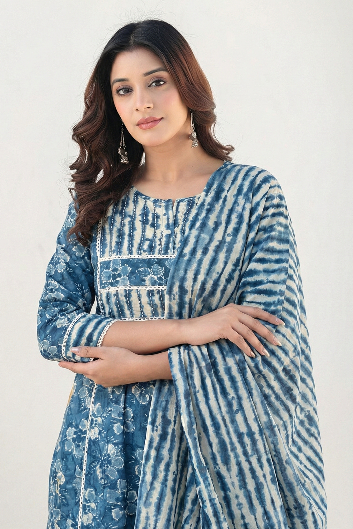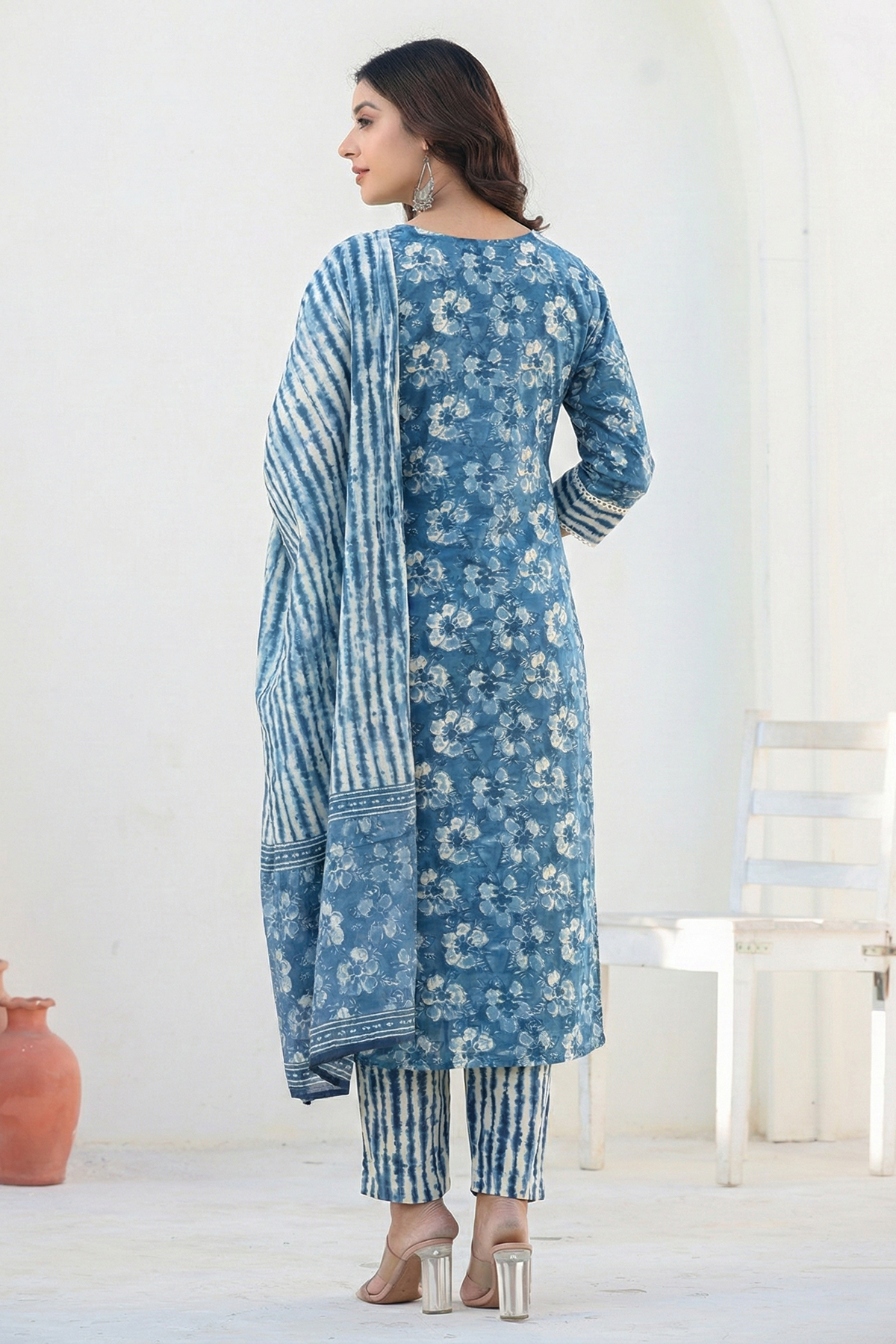 Blue Beige Printed Cotton A-Line Suit Set