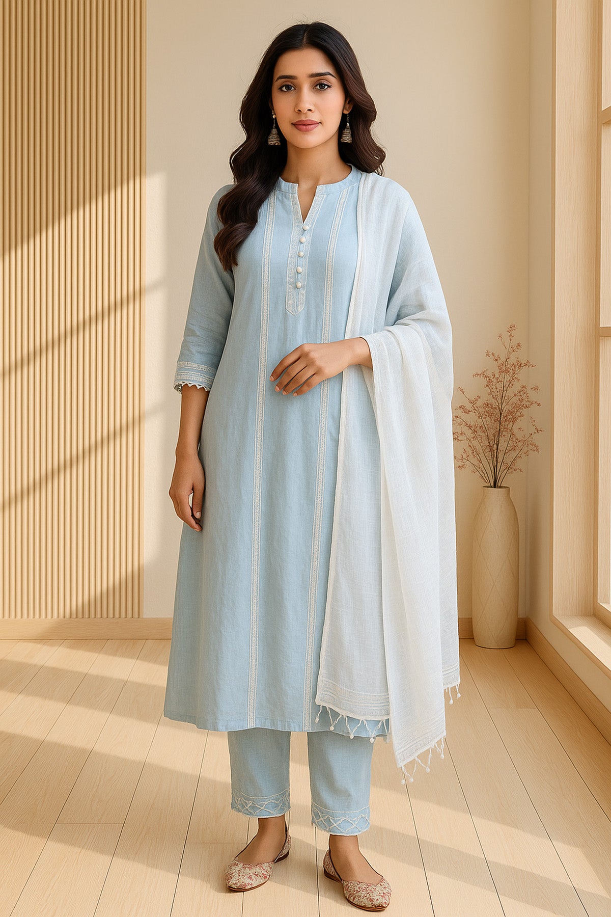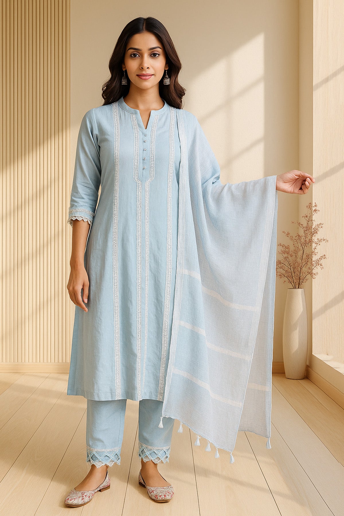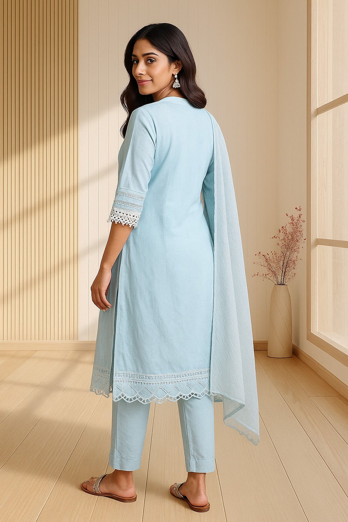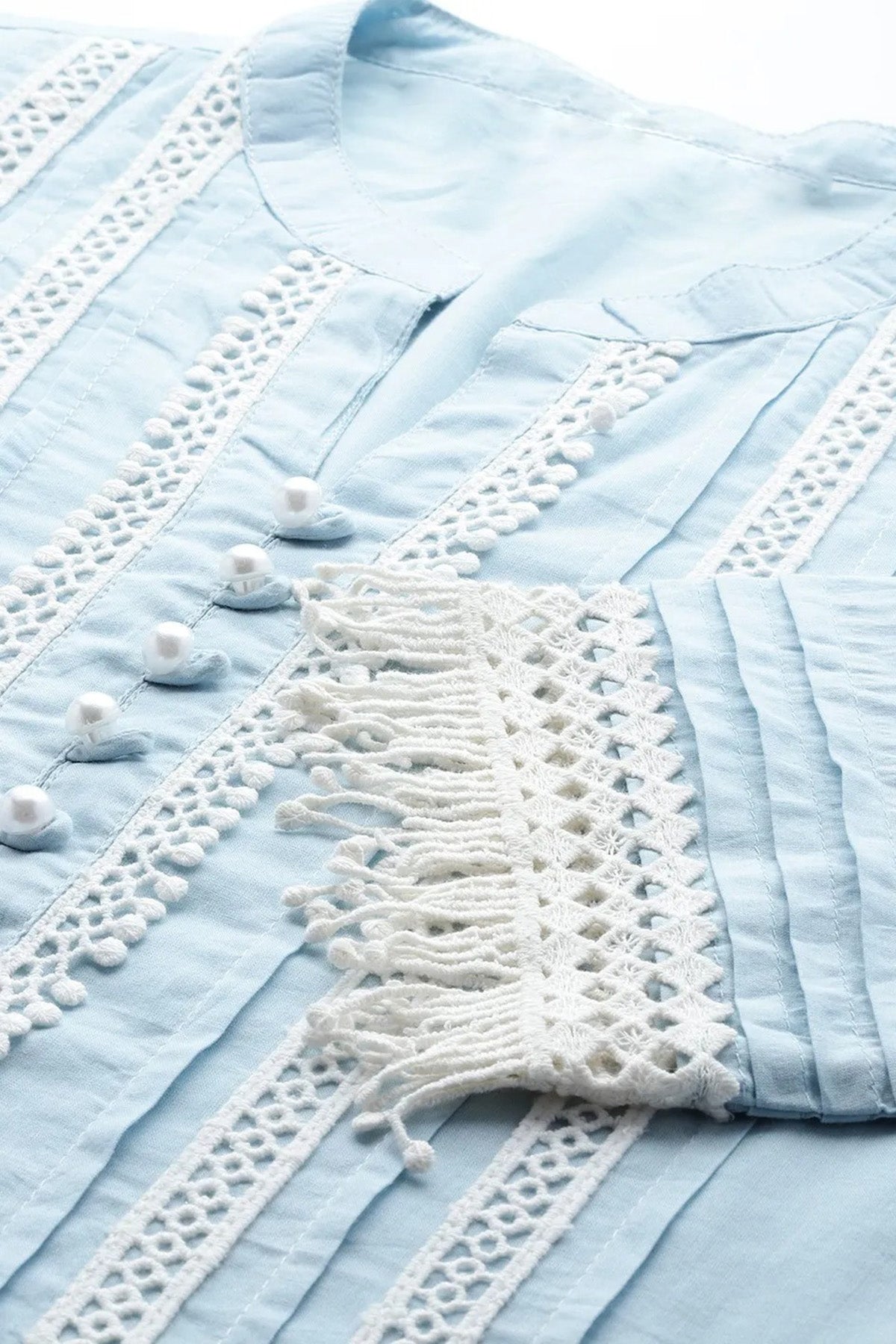 Sky Blue Straight Suit Set with White Lace Work