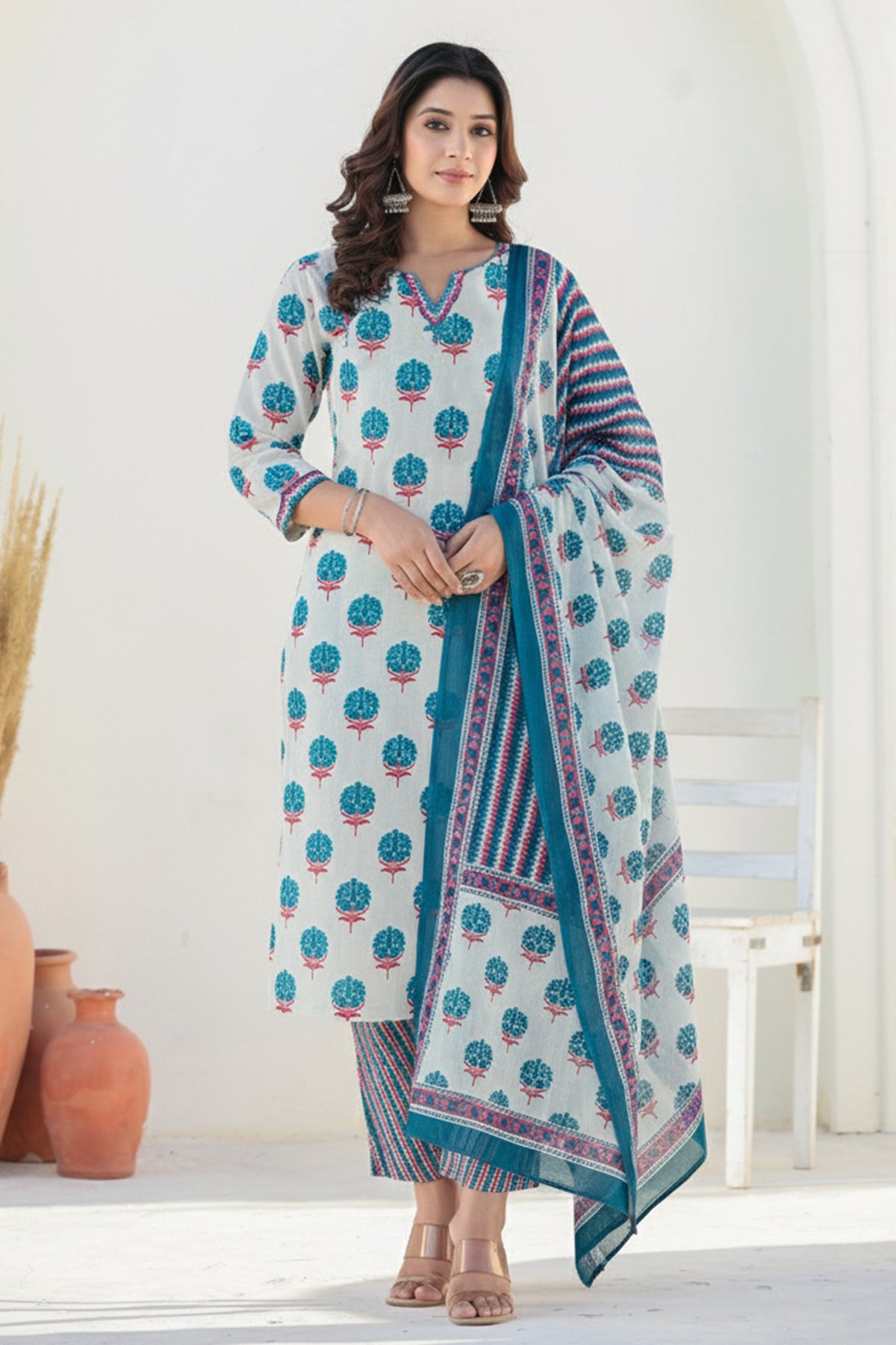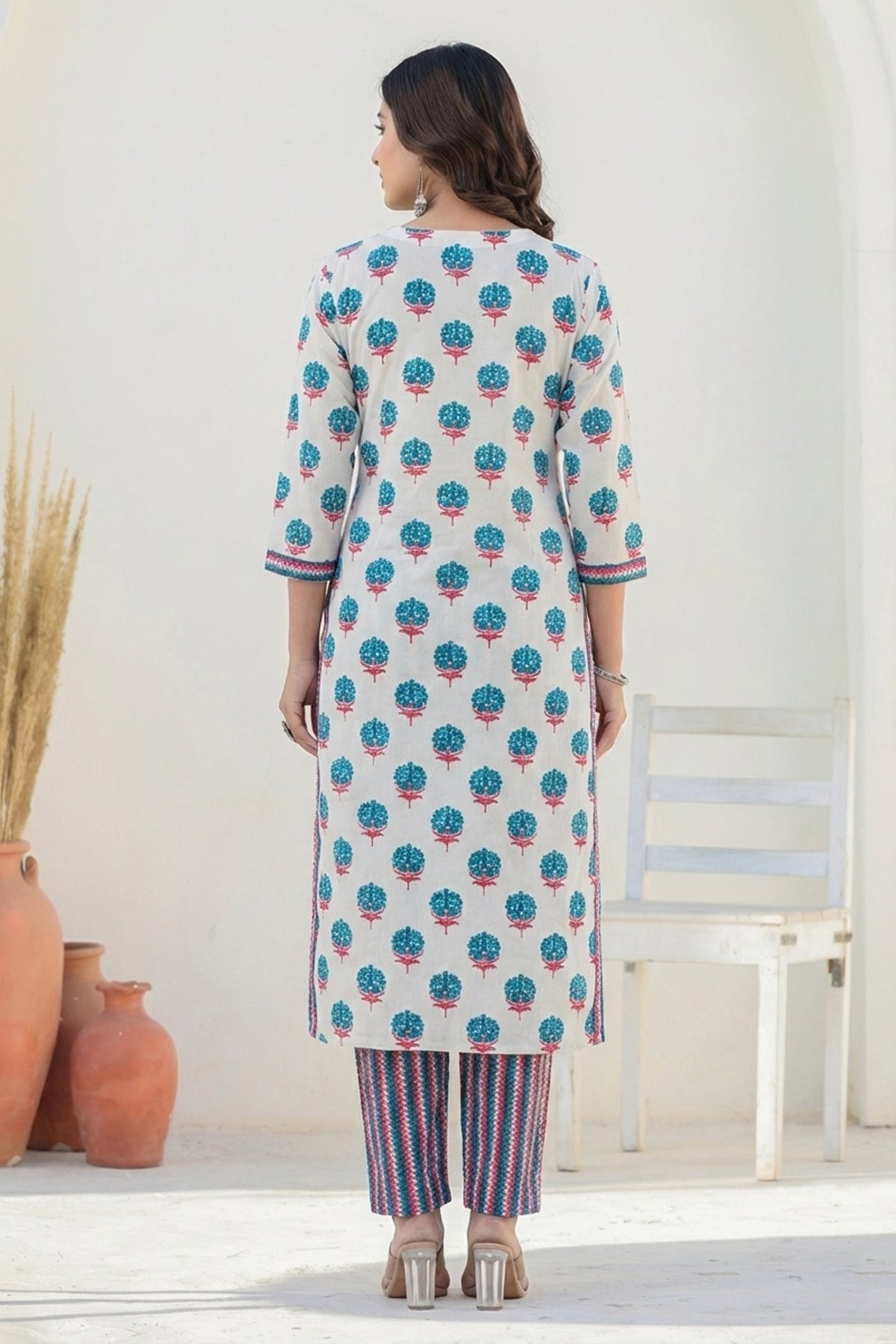 White Blue Cotton Straight Kurta